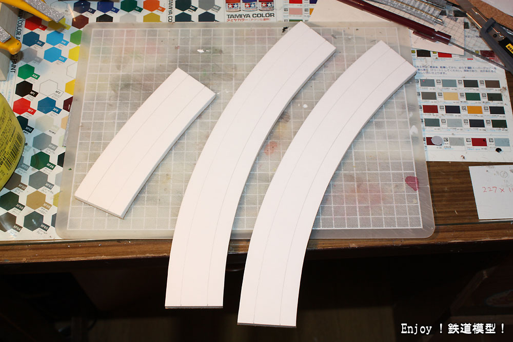 ![]() TOMIXファイントラックの 線形にあわせたベース | ![]() 重しを乗せて 木工用ボンドで接着 |