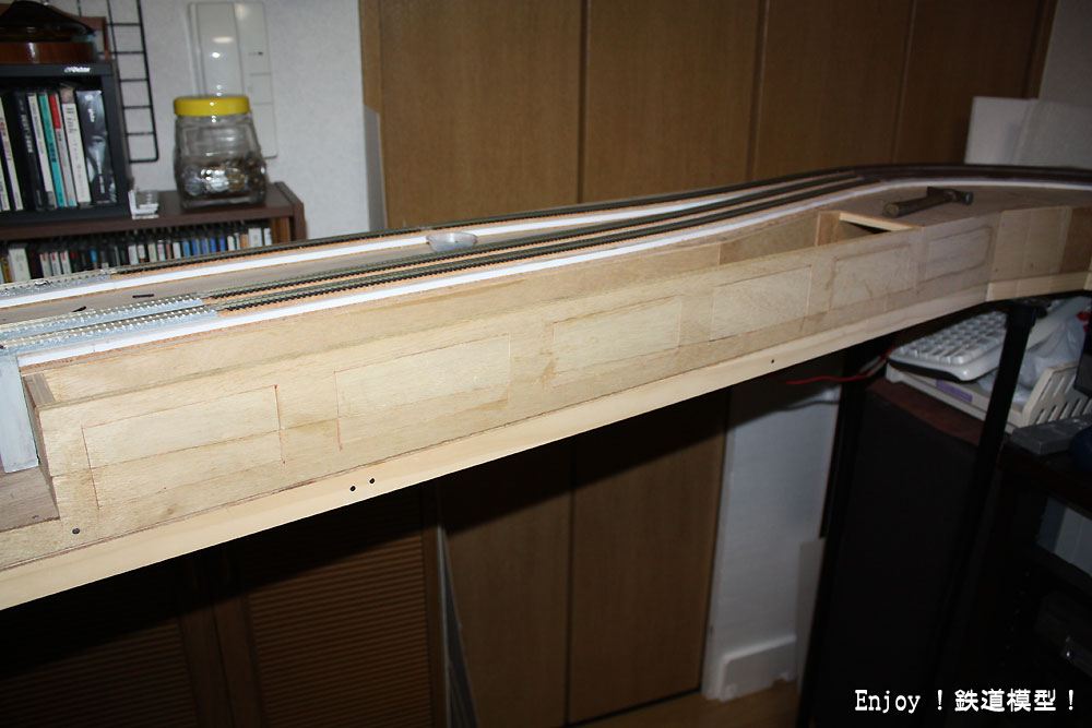 保守用の穴を埋めたら、次は上の路盤の修復です。もともとは勾配区間のつもりでしたので、路盤は無い部分になっていますので、あらたにベニヤ板を切り出してふさぐ必要があります。