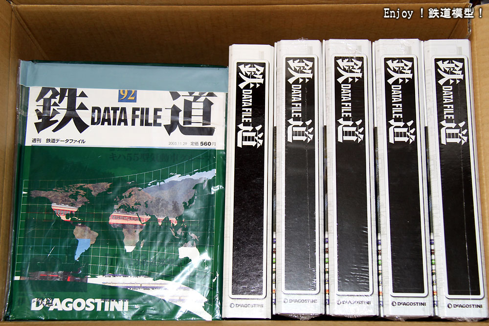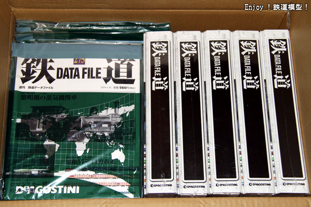 デアゴスティーニの「週刊鉄道データファイル」は、2004年2月から2009年12月までの間に300号発行され完結した鉄道の分冊百科です。私は創刊から買っていましたが、カーモデルの方の雑誌に投資を向けるようになり、60号くらいまでで買うのをやめてしまいました。鉄道模型を再開してから、情報百科として欲しいなぁと思い続けていたところ、ヤフーオークションで全300号(しかも、ほとんどが直送定期購読封筒未開封)+バインダー39個で27,000円という価格で出ていましたので、衝動的に買ってしまいました。