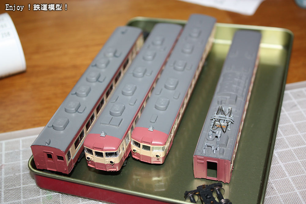 前尾照灯ユニットのストックもありますが、手持ちの車輌の中に、オークションで1,700円で買った457系4輌があります。モーター車があったので買ったのですが、届いてみると水没したことがあるのかモーターがさび付いて回らないし、アンテナは折れているし、車体は傷だらけですし、私がオークションで買った唯一の失敗取引です。幸いにも、この中のクハ455とクモハ457に前尾照灯が装備されていましたので、今回はそれを流用することにしました。