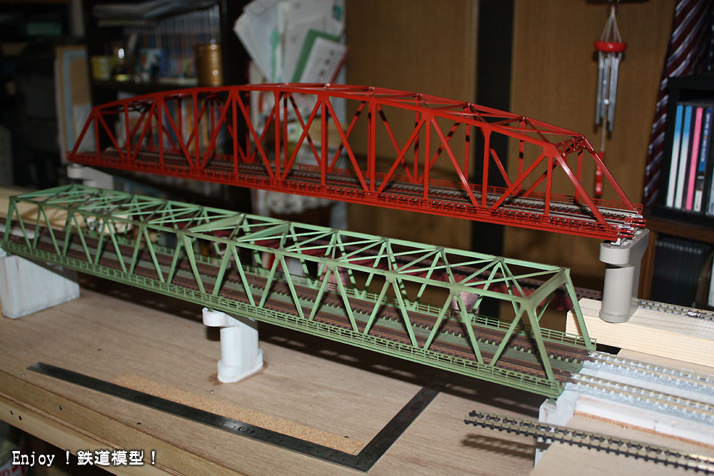 複線曲弦大トラス鉄橋は、新幹線用のオール高架の専用線路を敷設する予定ですので、それに使おうと思って購入しました。先日書いた通り、レイアウトを見直すことも考えていますので、本当にこのように使用するかどうかはわかりませんが、一応、在来線の鉄橋の横に設置しようと考えています。色は、どうせ塗装し直すので、在庫がふたつ以上あった赤にしました。