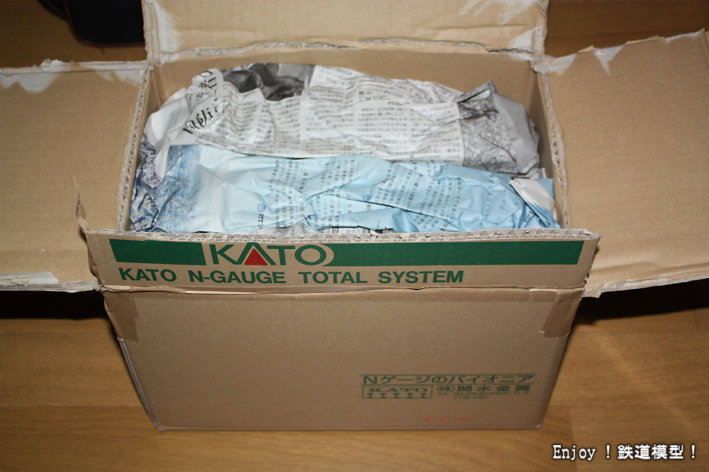 さっそく中身を確認してみます。梱包は、先回の101系の時は新しいダンボール箱でしたが、今回はKATOの箱を流用です。梱包は、商品を薄い紙で包んだだけで、あとは新聞紙を詰め込んであるという方法です。上はいいのですが、底は敷いた新聞紙と薄い紙だけの保護になりますので、ちょっと心配な梱包方法です。