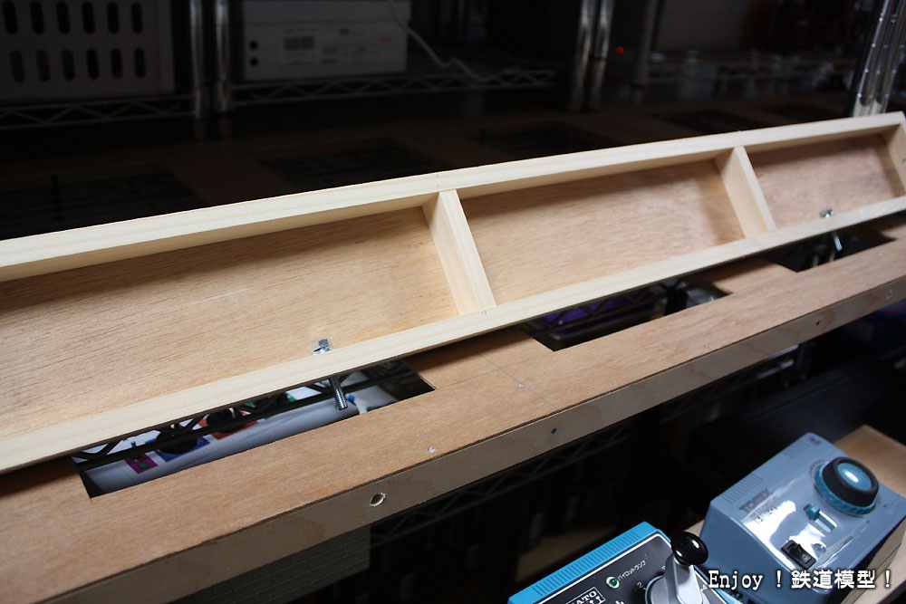 【E】正面拡張工事 「Enjoy!鉄道模型!」(2011/7~2018/2) 2012年12月7日(金) 23:592023年12月12日(火) 20:02 正面部分のベースパネルの拡張工事が終了しました。 拡張部分は1820mm×100mm(910×100をふたつ)。わずかですが、拡張できるところは後々後悔しないように拡張しておく予定です。拡張部分は、木工用ボンドではなく、6mm径の長さ35mmの六角ボルトとナットでの固定としてあります。 正面部分・拡張前 (2012年12月5日) 正面部分・拡張後 (2012年12月6日) 結合部分・結合前 (2012年12月6日) 結合部分・結合後 (2012年12月6日)