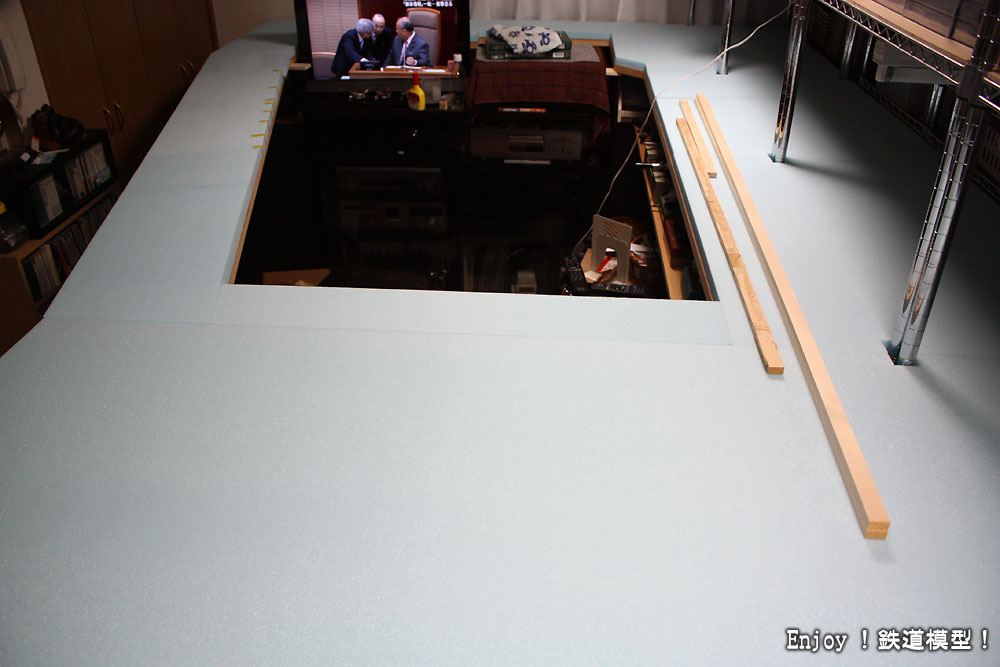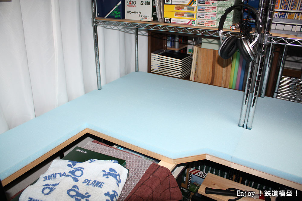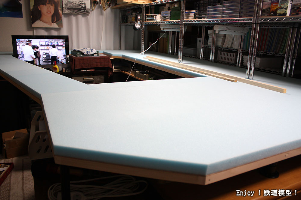 次の作業は、このスタイロフォームを取り囲む板をベースパネルに取り付けることと、線路配置の現物あわせでの決定ということになります。暫定でいいので、早く走らせられる状態に持っていきたいものです。