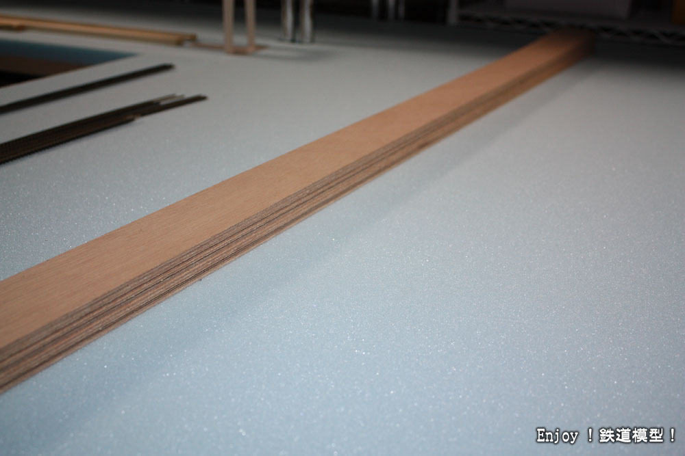 右の写真は、この前の土曜日に買ってきた幅60mmに切り出したベニヤ板です。いつもならば定尺ベニヤ板を買ってきて自分でカットするのですが、今回は手間を省くのときれいに正確に切り出したかったので、定尺ベニヤ板を買ってホームセンターでカットしてもらいました。枚数は、とりあえず12枚。これで余裕で足りるはずです。ベニヤ板の厚さは2.3mmです。