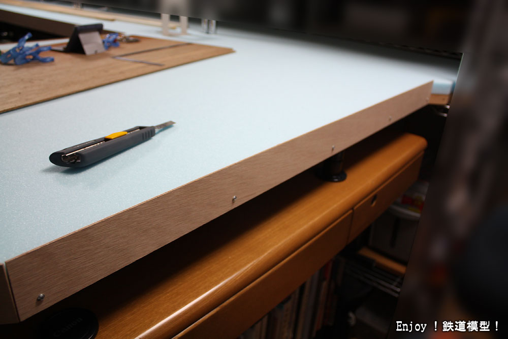 それを何に使うかというと、ベースパネルに置いたスタイロフォームを動かないようにするための枠に使います。下の写真のように、ベースパネルの周りを囲むようにネジで固定しました。こういうのを取り付けると、台枠らしくなって早く線路を敷きたい衝動にかられますが、そこはぐっと我慢して焦らずにきちんと考えて作業していくことにします。