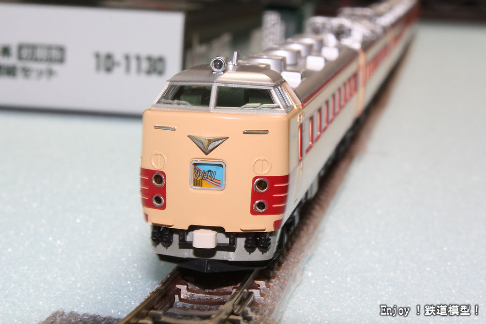 ついでに、所有している485系300番台の旧製品との比較です。細部の作りこみはそれほど向上した感じはしませんが、全体的に塗装がしっかりしていること、Hゴムの表現や細部塗装が施されていること、車端床下機器などが表現されていることなど、やはり新製品はすっきりとしていていい感じです。写真では、前面ライトの内側がクリームのままで目だっていますが、肉眼ではまったくわかりませんので、写真で見るよりはもっとすっきりしていて美しい仕上がりです。比較するとヘッドマークも無点灯にもかかわらず明るさが全然違うのも面白いです。
