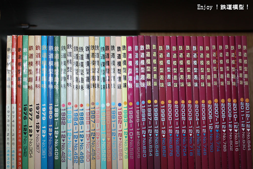 なんと、12月号だけで40冊(1994年は印刷ミスで背表紙が10月号になっています)です。最初の頃のものは中学生の頃。いろんな記事を見てはそれを参考に自分で欲しい車輌を作ったり、今までにない完成品が発売されると嬉しくて嬉しくて、小遣いをためて少しずつ揃えたものです。もちろん、現在のように実編成を組むなんて考えはなくて、全種類を1輌ずつ買って、それをつなげて走らせて楽しんでいました。