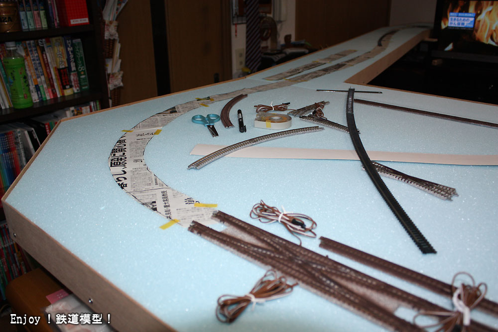 ![]() ラフなプラン図(線路配線案) | ![]() 新聞紙で路線検討 |