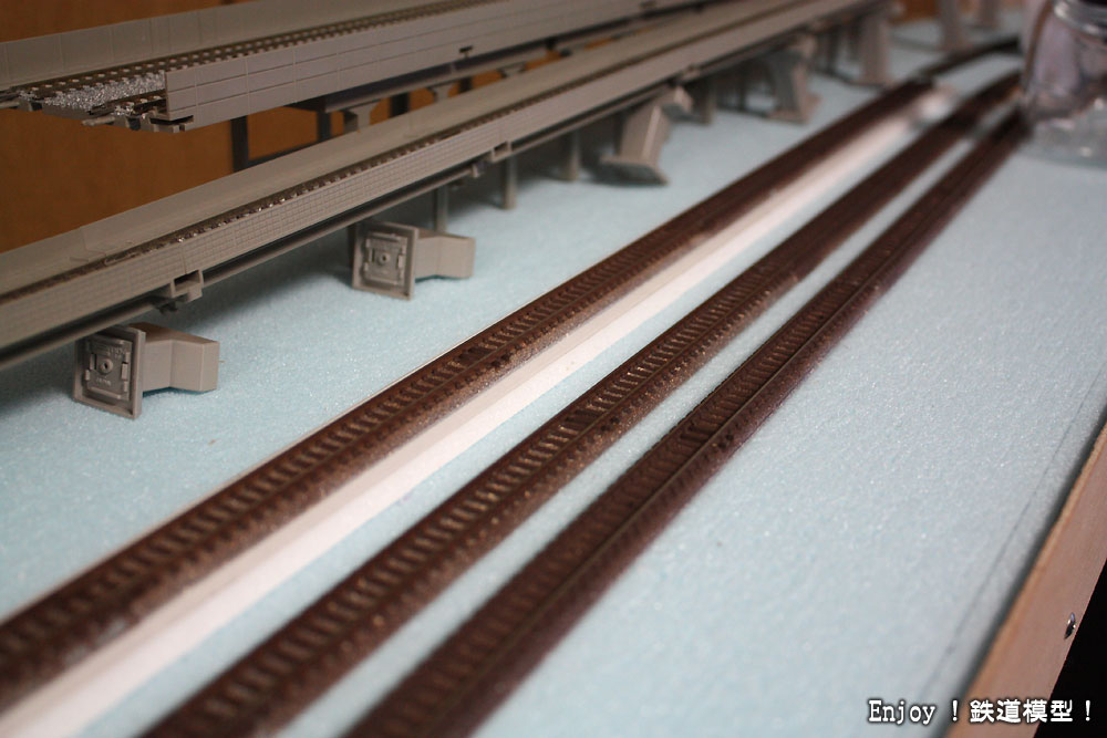 これが一段高く上げた部分です。3線並ばせるよりも、複線と単線の区別がきちんとついて変化もあって、良い雰囲気になるんじゃないでしょうか。