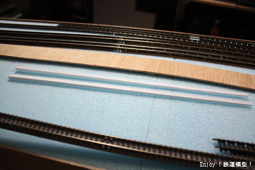 今日の作業は、駅と反対側の貨物線想定部分です。この場所は、複線との差をつけるために、単線の貨物線想定は一段高く上げることにしました。高くと言っても、勾配を考えて5mmだけですが、ベニヤ板でわずかですが勾配をつけます。