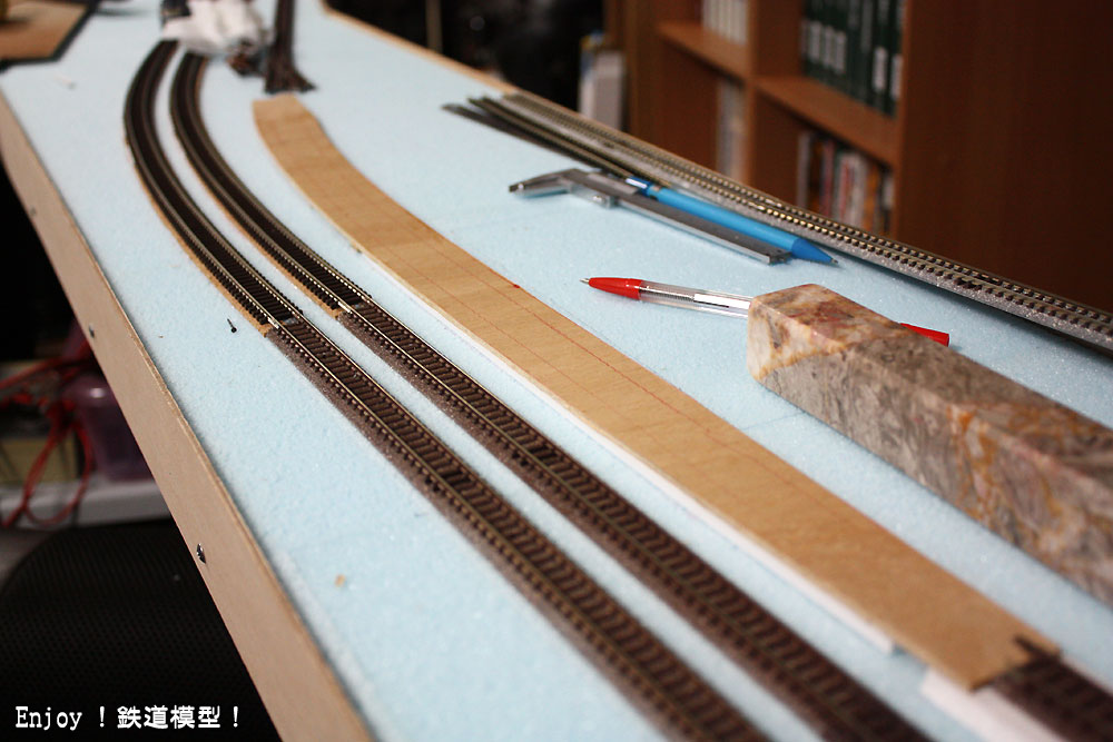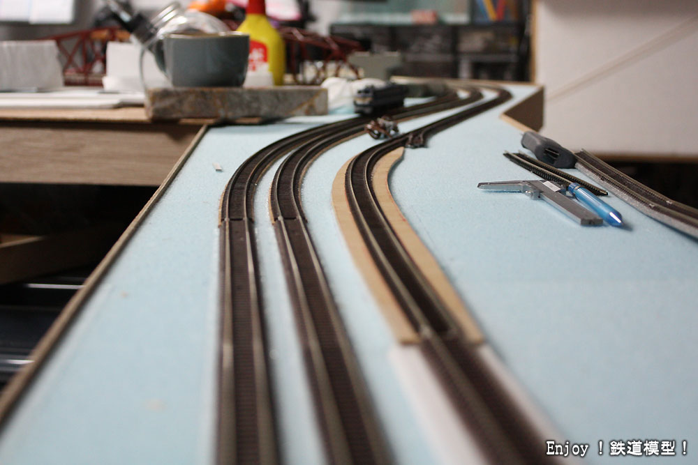 フレキシブルレールを木工用ボンドで貼り付けて、重石をのせて固定中。ゆるやかな勾配&カーブ部分ですが、0.5mmのカントをつけてあります。
