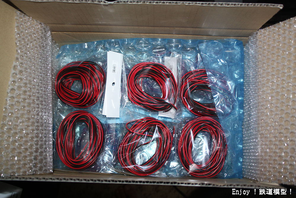 中身は平行ケーブルです。10mのが12個で、6個と6個で太さを少し変えてありますが、どちらも10m200円台で買うことができます。青-白など、色のバリエーションが豊富にあればさらに満足なのですが、赤-白しか無いのが少し残念です。120m買っても送料込みで3000円台ですので贅沢は言いませんが。