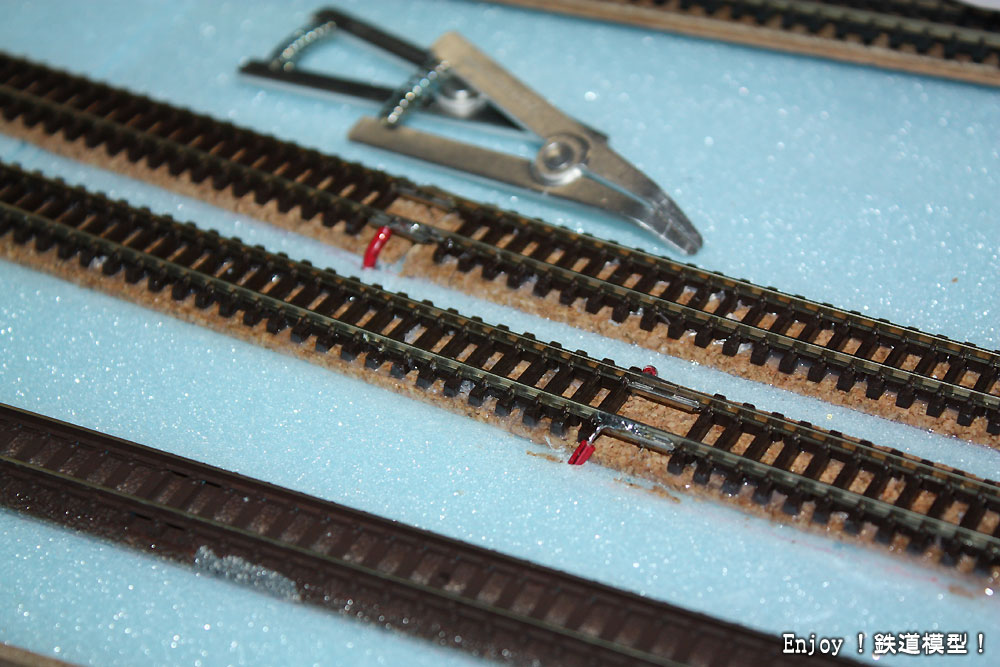エンドレス走行が可能になったからといって、すぐに車輌を走行させることはできないのです。そう、電源供給のフィーダー取り付けがまだなのです。レールに直接ハンダ付けのフィーダーを取り付けていきます。FineTrackの選択式ポイントの配線を有効に活用していきますので、エンドレスひとつに3ヶ所のフィーダーとなります。