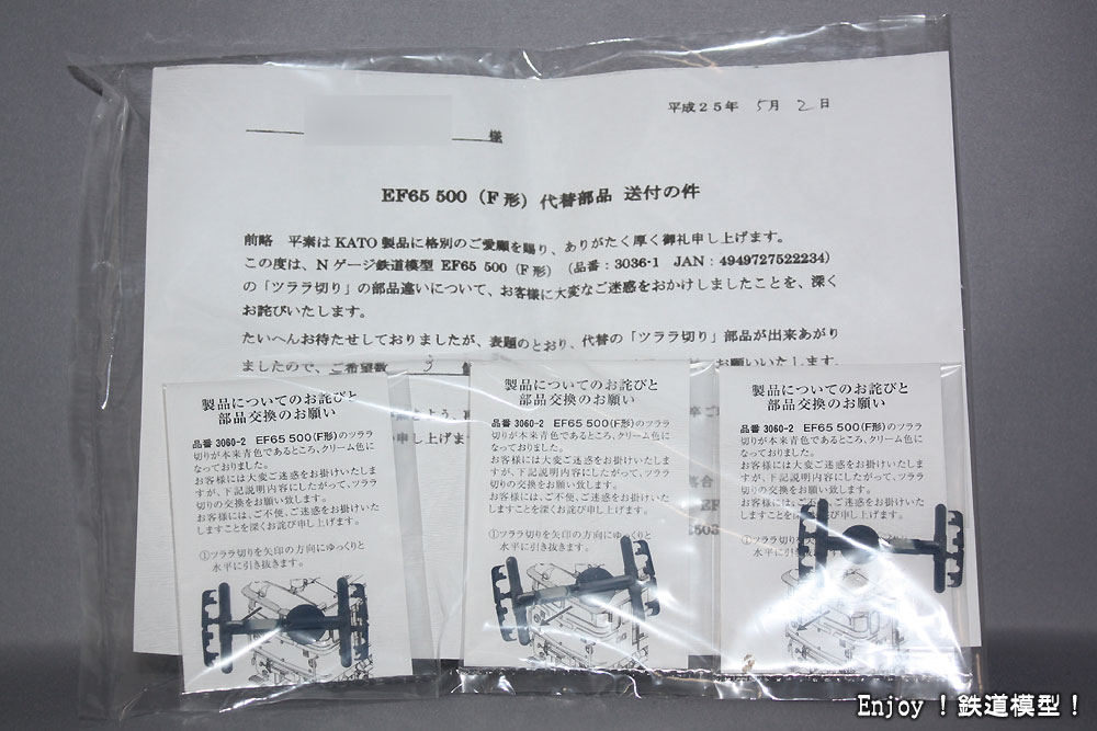 ひとつは、EF65 500(F形)のツララ切りです。5月1日にメールで請求して昨日5月3日の昼には届いていましたので、とても迅速な対応をしていただいていると思います。いつものことですが、小さなパーツの送付でも、しっかりとした箱で送られてきます。