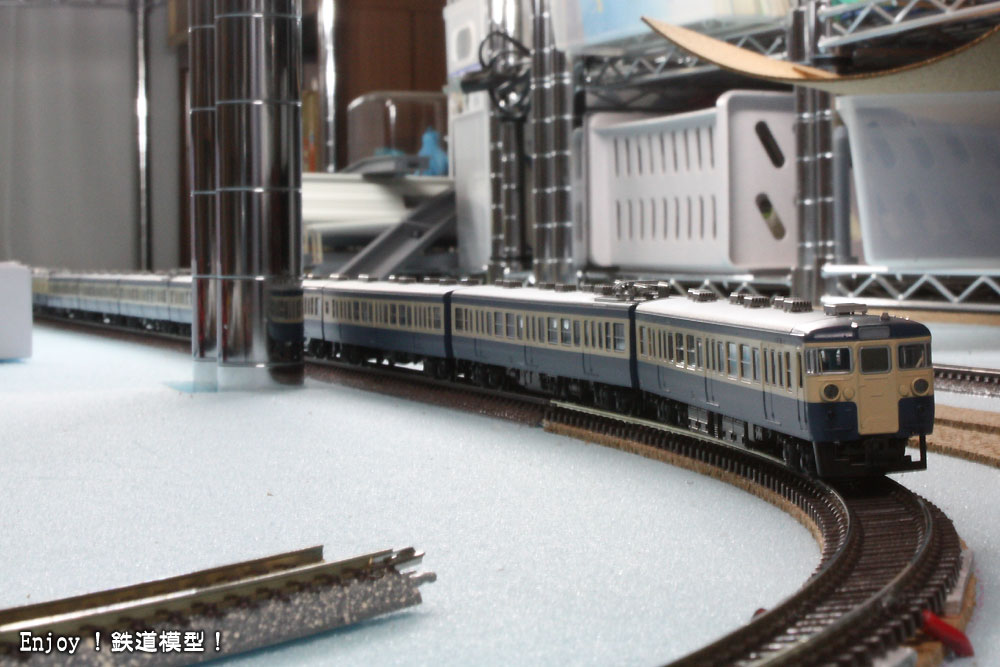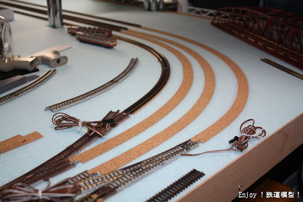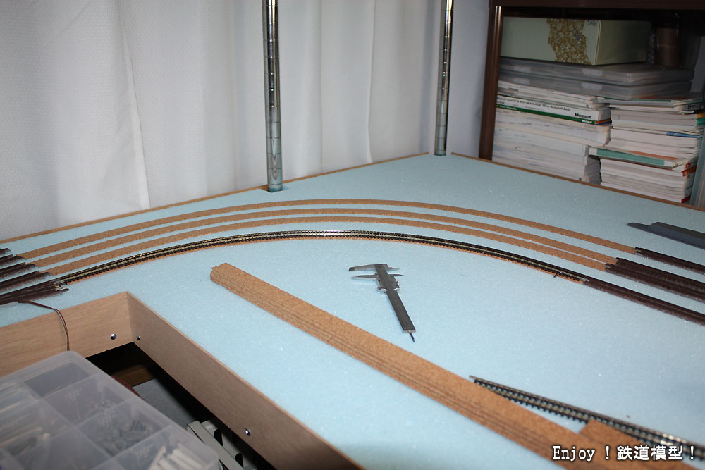 【E】4ホーム開通間近! 「Enjoy!鉄道模型!」(2011/7~2018/2) 2013年5月7日(火) 23:592023年12月12日(火) 19:47 駅の4ホーム分の線路敷設が終わっていますので、その線路への進入線路を敷設します。 駅の右部分の進入線路部分に、コルクシートを貼り付けたところ。 同じく、駅の左部分の進入線路部分に、コルクシートを貼り付けたところ。 どちらも、曲率連続(=緩和曲線入りカーブ)となるように位置決めをします。 明日はいよいよフレキシブルレールの敷設を行い、4ホームともエンドレスループとしたいと思います。 作業後、115系800番台横須賀色の試走をおこないました。期待以上の良い出来栄えです。
