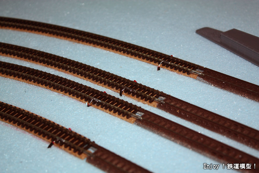 【E】複線本線の線路敷設完了! 「Enjoy!鉄道模型!」(2011/7~2018/2) 2013年5月13日(月) 23:592023年12月12日(火) 19:45 本線(複線)の駅左側の進入線路の敷設が終わりました。 真ん中2線が本線。その両側が本線の待避線となります。 この外側に単線の貨物線とヤードへの進入線が敷設される予定です。 フィーダーもすべて取り付け完了。 駅右側の進入線路にもフィーダーを取り付けました。 これで、本線(複線)と駅4ホームが運転可能となりますが、試運転は明日の仕事にします。