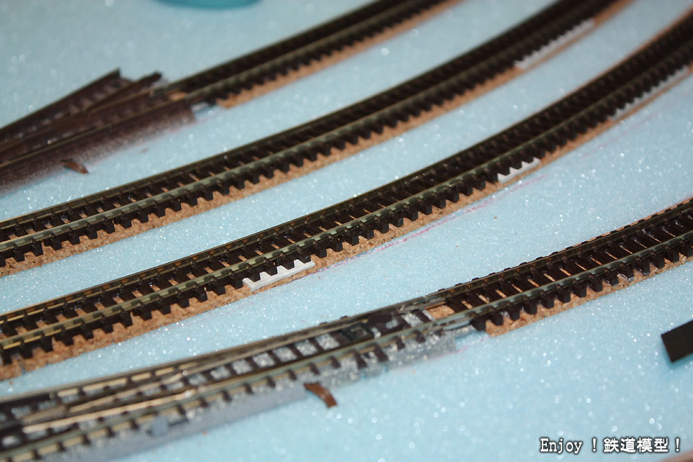 スペーサを線路の下に入れて、線路の高さの変化を滑らかにします。これで脱線回避できました。