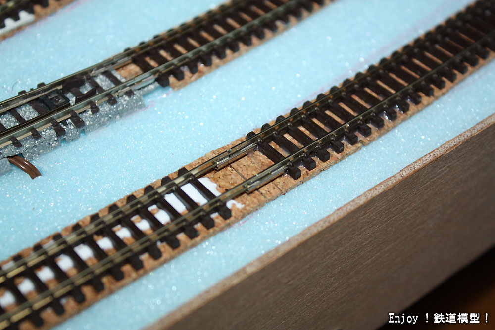 レールを接続するジョイナーは、一番しっかりしているTOMIXのものを使用していますが、けっこう大柄なので、枕木はそのままだとジョイナーの下に入れることができませんので、ジョイナーの部分をリューターで削る作業が必要となります。