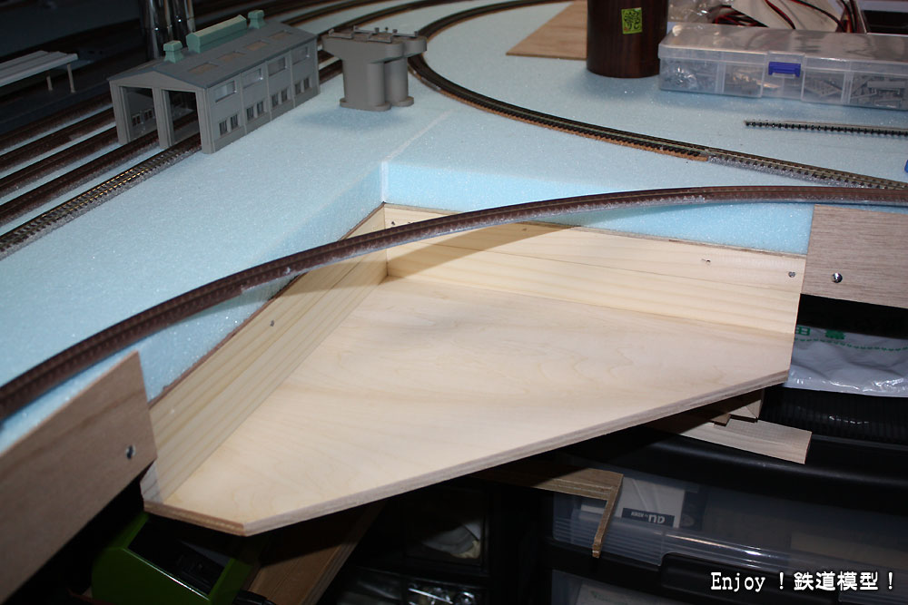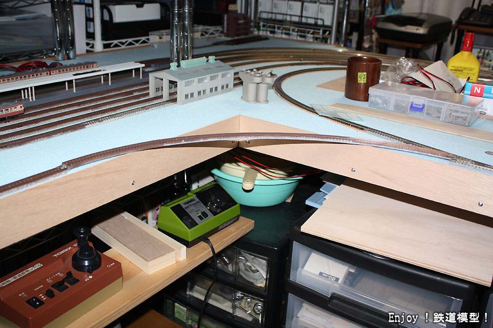 ここはリバース線ですが、レイアウト台枠をはみ出してカーブさせる必要がある部分です。ここは、台枠を拡張するとともに、高低差の楽しみも味わえるようにしたいと思います。