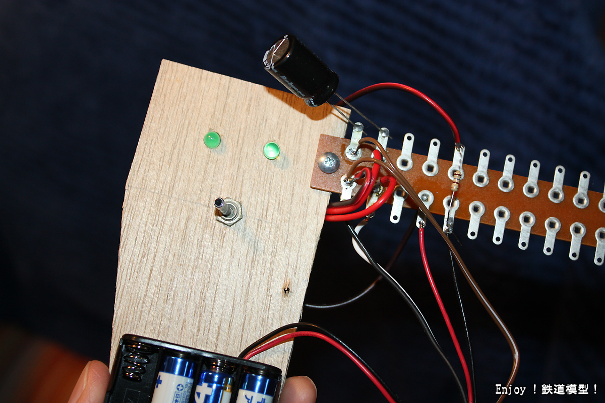 電源は仮として、ポイント駆動はパワーパックから17Vを供給、LEDランプは仮として単4乾電池4本の6Vとしました。本番では、専用電源で安定供給させるつもりです。