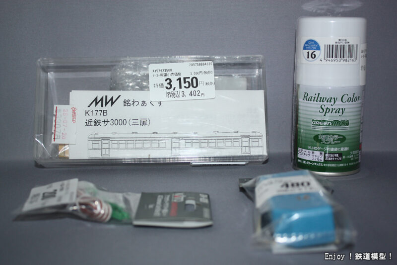 ちょっとがっかりだったのですが、それを吹き飛ばす掘り出し物を見つけました。「銘わぁくす」の「近鉄サ3000」キット(残念ながら3扉化されたもの)です。近鉄2200系をずっと前から探していたのですが、昨年再発売されたようです。店員さんに、「近鉄モ2200」と「近鉄モニ2300」も欲しい旨をつたえて、「銘わぁくす」さんに確認してもらえることになりました。できれば6両編成にして、私が小学生の頃に見ていた近鉄急行を再現したいという長年の夢が叶うといいのですが・・・