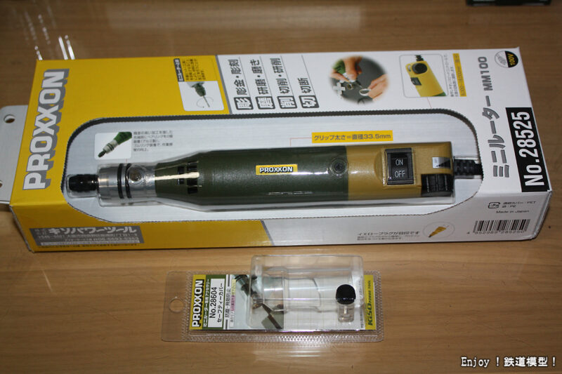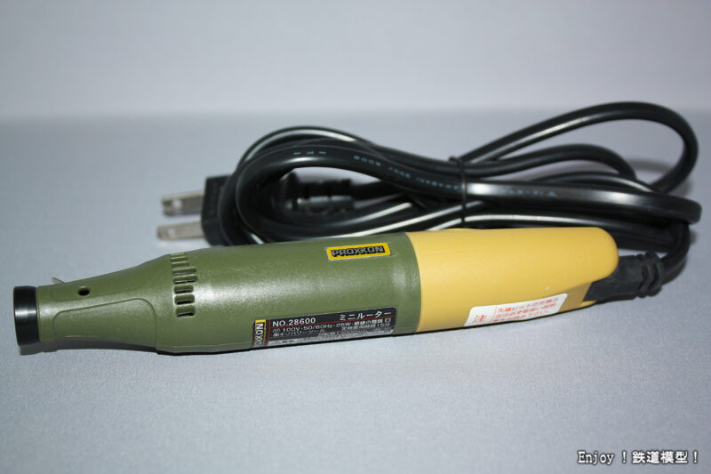 下の写真が、長年使用してきた今回DD16のカプラー取り付け座を削るのにも使ったプロクソンミニリュータNo.28600です。これは、安価なのとビットの取り付けがワンタッチで使いやすいのはいいのですが、ビットをきちんと固定できずに緩んでしまうことが多いのが欠点でした。緩むことと回転数不足でレール切断は実質不可能というのも大きな不満でした。