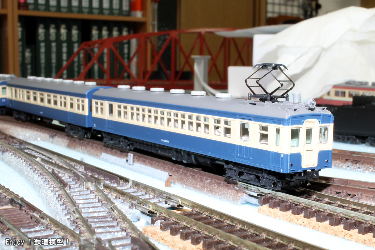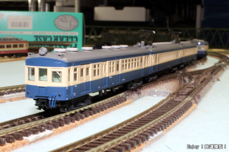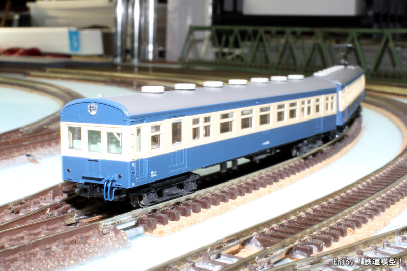 動力車が編成中に複数輌あっても問題ないように、このシリーズの動力台車には、トラクションタイヤがついていませんので、動力車2輌の5輌編成でもスムーズに走ってくれます。ただ、ライトのON/OFFスイッチが床下ではなく車内にあるので、気楽に編成を変えてライトをON/OFFとできないところが難点です。今回の試走も、連結面はヘッドライトもテールライトも点いたままです。ジャンパ栓の取り付けは、すぐに弾き飛ばしてしまいそうでいつもながら神経を使う作業ですが、問題なく完了。