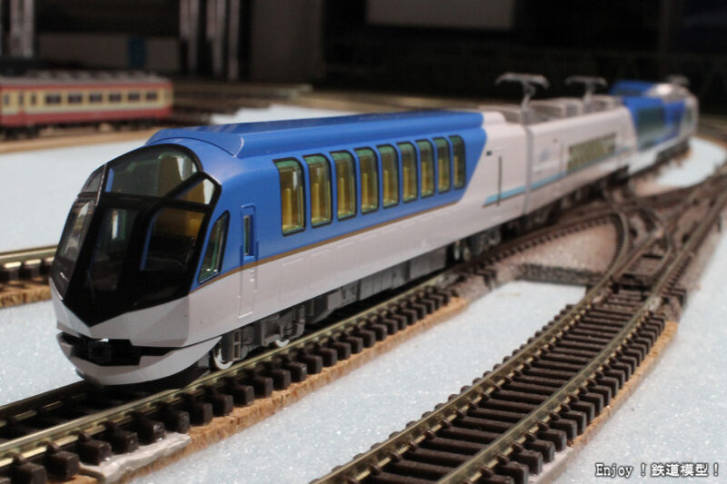 では、いつもの線路だけのレイアウトですが、「小田急ロマンスカー・NSE (3100形)」と「近鉄50000系しまかぜ」の競演です。このくらいの長さの編成の場合は、駅のホームが長すぎますね。いつもこのくらいの長さの編成を前提とするならば、レイアウトの線路配置ももう少し余裕で考えられるのですけどね。(^_^;)