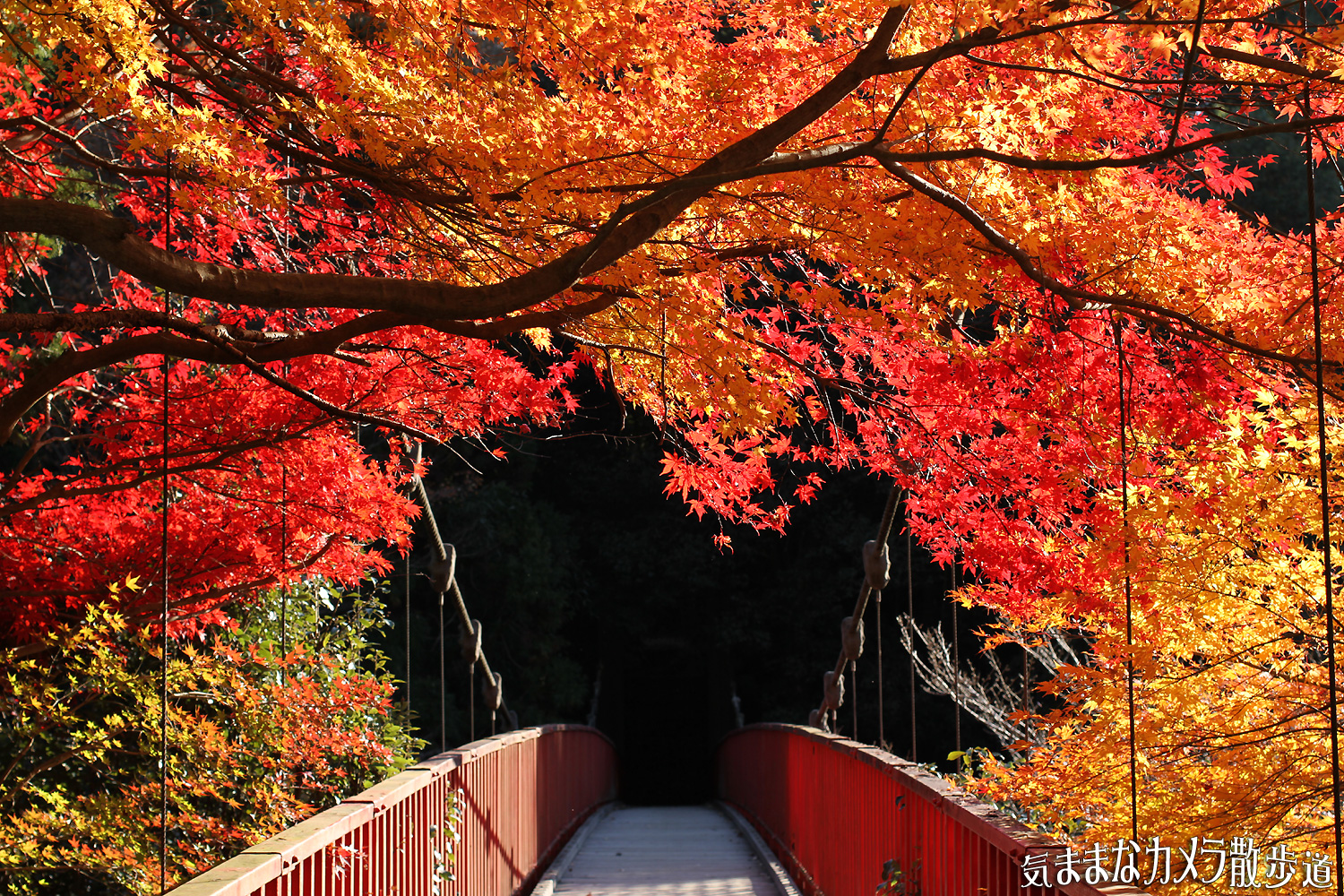 【C】吊り橋の紅葉 「気ままなカメラ散歩道」(2014/7~2018/2) 2014年11月13日(木) 0:092023年12月12日(火) 18:40 王滝渓谷の中之瀬大橋にかかる紅葉です。 ◆撮影日:2013年11月23日 ◆撮影場所:豊田市 王滝渓谷 ◆カメラ:CANON EOS 7D ◆レンズ:CANON EF40mm F2.8 STM ◆撮影データ:1/200秒 F5 ISO100 -0.7EV 太陽光 40mm