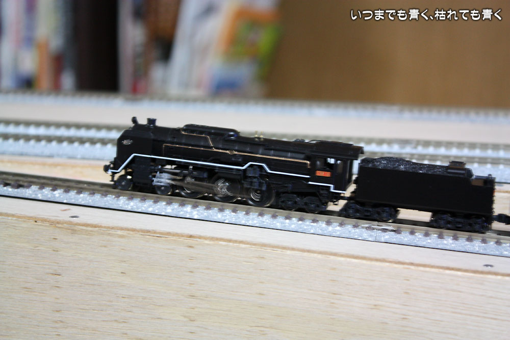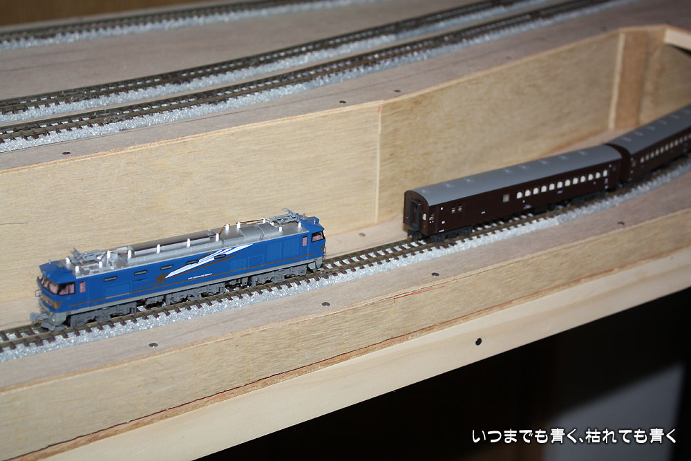 もう一点は、直線部分の勾配の登りきる部分でさすがのEF510も少し空転をしてしまうことです。勾配のつけ方がまずくて、線路が折れる感じになってしまっていて線路の形状に動輪が追従できないことが原因と思われます。滑らかな勾配になるように、ベースを少し修正したいと思います。