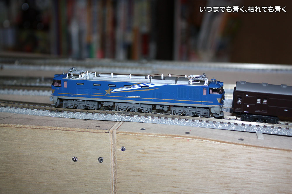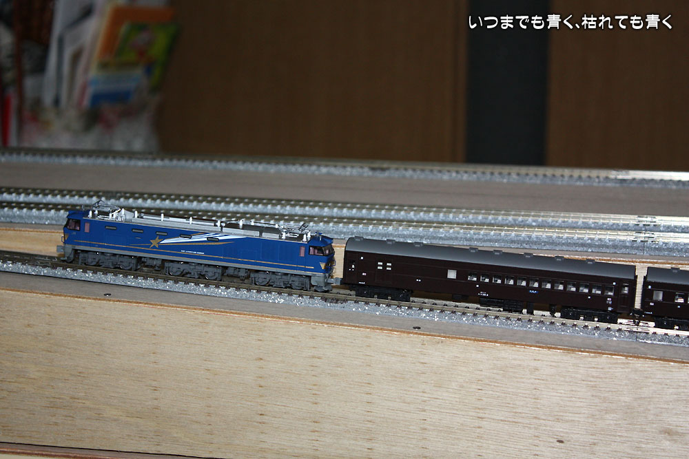 まずはシビアなC62+スハ44系13輌編成でのテストをおこないましたが、登り坂の途中で動輪が空転して登りきることはできませんでした。蒸気機関車は重さと重心の点で牽引力はそんなにありませんので、これは想定内の結果です。電気機関車ではどうかということで、最新機のEF510北斗星色で同じスハ44系13両編成を牽引させてみます。さすがにEF510は超スロー運転でもしっかりと登りきってくれました。