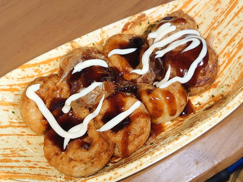 今日の間食はたこ焼きとケーキ。そろそろ健康診断なので体重を減らさないといけないのですが。