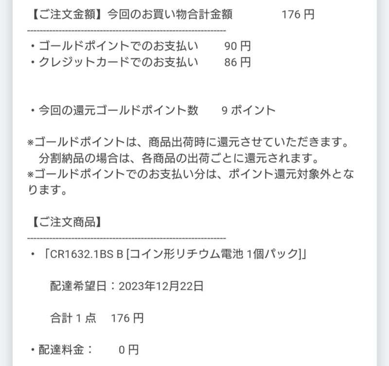 ヨドバシさん、いつもありがとうございます! 買物の話 2023年12月22日(金) 11:56 ミラココアのスマートキーの電池が消耗したので、ヨドバシ・ドット・コムさんで注文しました。価格は176円、ポイントを使ったので実質86円です。9ポイントの還元もあります。それでヤマト運輸の宅急便扱い(投函扱いではない)で送料無料。いつもながら、ヨドバシ・ドット・コムさんのこのあたりのしくみがどうなっているのかわかりませんが、消費者としては本当にありがたいです。いつもありがとうございます。