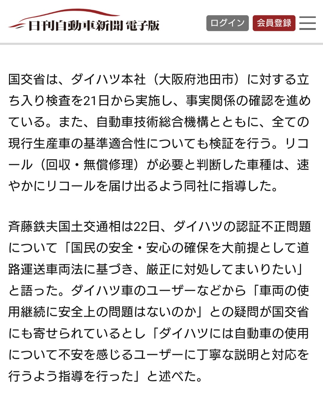 言われる前に自ら 世の中の出来事の話 2023年12月23日(土) 9:55 国交省に言われる前に、たくさんのダイハツ車ユーザーを安心させる動きを自らしてほしかったです。私にも不信感が広がっていきます。ダイハツ自らの結果だと信用されないし、国交省による安全性確認が必須なので仕方がないと思いますが、それでもダイハツの事後処理の無責任さを感じてしまいます。今回の問題で親会社の株価もさがっており、その親会社の今回の問題に対する指導力が見えないのも残念です。