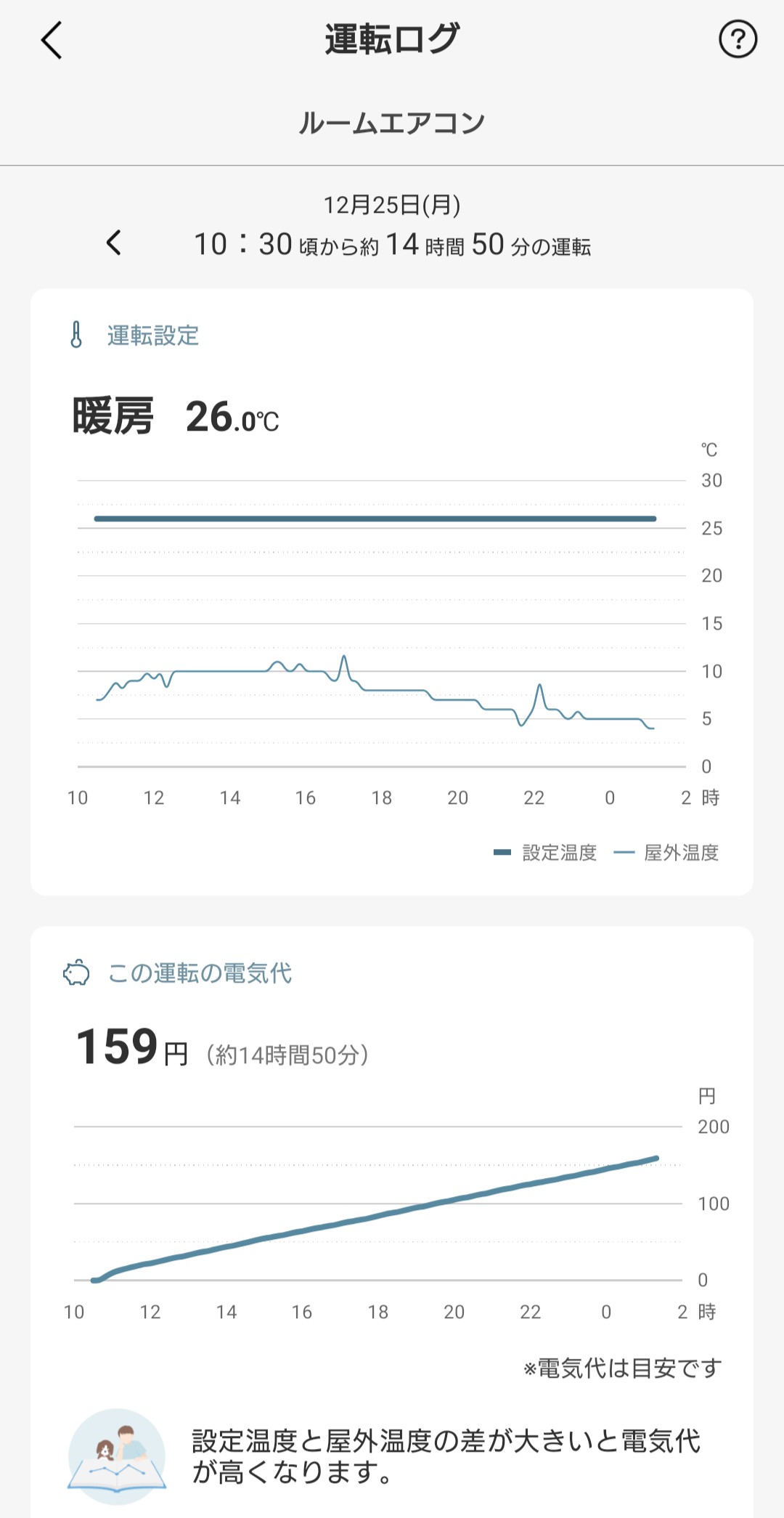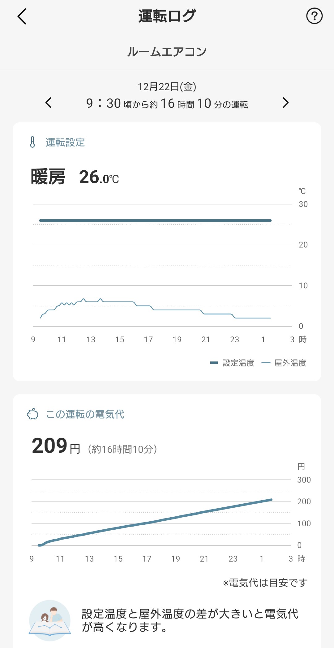 エアコン暖房 住宅の話 2023年12月26日(火) 10:37 我が家の暖房は、燃える可能性のあるものを使いたくないのと結露による家への影響が嫌なのでエアコンのみです。私の部屋のエアコンの暖房費は、朝から夜遅くまで稼働させていると200円(概算)くらいとでます。概算なので実際の電気代とは乖離はあると思いますが、一部屋このくらいで火事と結露による家のダメージを予防できるならいいかと思っています。今年は昨年よりは使用料は少ないようです。
