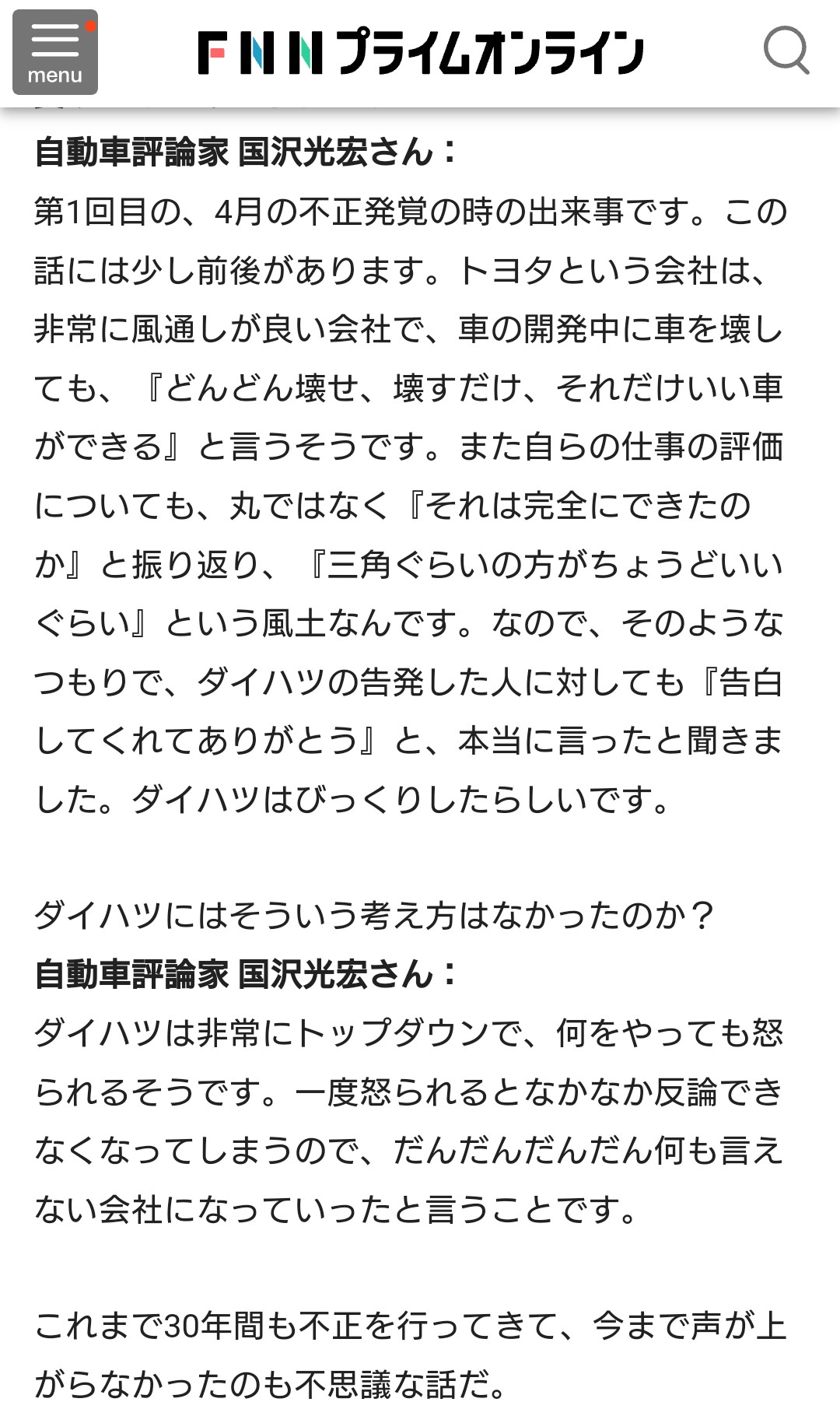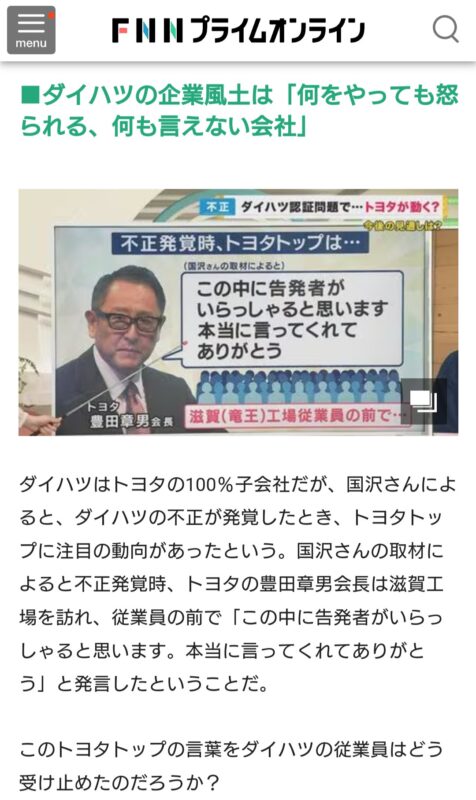 企業風土 世の中の出来事の話 2023年12月27日(水) 11:15 こういう発言があったのですね。自分の経験ではトヨタという会社は役員とも距離が近く何でも言えたと思っていたので、トヨタから送り込まれた幹部がトヨタの企業風土を子会社に浸透できなかったのはトヨタの企業風土にも自分の知らない問題があったのかと危惧していましたが、少し安心しました。もっとも、安全第一の企業風土にできなかったことは事実だし、起きてから告発してくれてありがとうと言っても遅いので、親会社の責任がなくなるわけではありませんが。