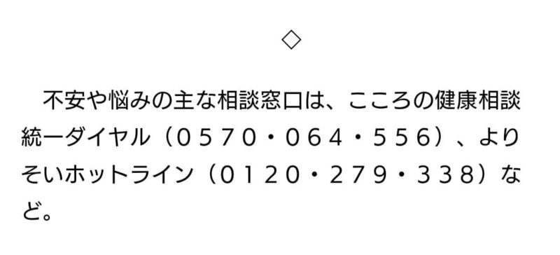 不安や悩みの相談窓口 世の中の出来事の話 2023年7月13日(木) 7:552024年1月10日(水) 20:24 自殺や自殺未遂の事件が起きると、必ずその報道のあとにはこれが伝えられます。でも、死を考えるようなかなり追い込まれた状態では、自ら相談などしないものです。周りが気づくこと、軽い状態の時に相談すること、それが大事なんだと思います。だから、これは事件が起きた時だけでなく、いつも伝えるべきことなんです。電話番号もわかりやすく「786(悩む)」とかの覚えやすい短い番号にできないものなのでしょうか。