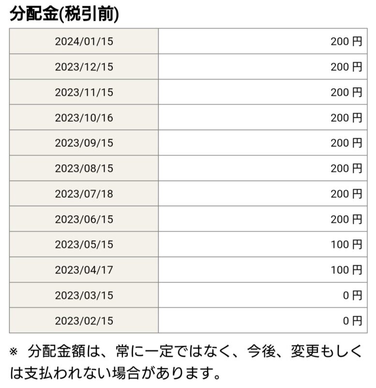 投資の商品はいろいろとありますが、私の場合は性格が日々の投資活動に向いていないとよく言われますので、好きな趣味をしながら、リスク少なく放置して長期的に膨らんでくれればいいという商品や銘柄を選んでいます。なので、その利益は含み益ばかりで手に入る確定益は年に1、2回の配当くらいです。もう少し日々ありがたみを感じたいと思って、担当のおねーさんに「毎月小遣い程度でいいのでお金をもらえるものないかな」と相談して選んでもらったのがこれです。毎月の配当を謳う商品は色々ありますが、株価が下がった時にも配当を出すものは元本を食いつぶしてしまうので投資効率が悪いと聞いていたので手を出さなかったのですが、この商品は元本を配当(分配金)で食いつぶすことがなく、毎月の株価と基準価格に対して分配額が決まる(無しの時もあり)というもので、昨年後半から少しかじってみました。幸いにも始めてからずっと市場が好調で毎月200円(投資額約1万円あたり。投資額500万円ならば10万円。そんなにしてませんが。)の分配金が出て今月も200円で確定しました。毎月分配金を出すので株価は分配金分抑えられて大きく上がることはありませんが、こんな商品も面白いものです。