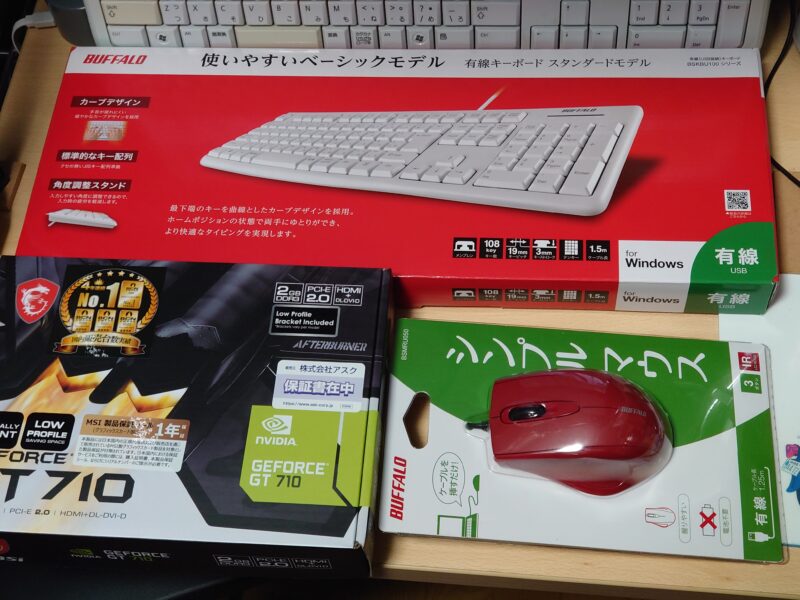 ずっと不調でもうダメだと思っていたパソコンですが、朝に立ち上げた時に2、3回画面が乱れたりブルー画面になったあとは、電源を切らない限り順調に動くので、どうしたものかと思案していました。買い替えるかどうかの最後の確認として、グラフィック機能をマザーボードオンボードのものから、独立したグラフィックカードに変えてみることにしました。マザーボードのグラフィック機能に問題があるならば、これで直るかもしれません。ついでに、エンターキーがおかしいキーボードと、クリックの反応がおかしくなっているマウスも入れ替えました。グラフィックカードで少し消費電力が増えるので、搭載しているBlu-rayドライブとDVDドライブをBlu-rayドライブだけにします。これで外観もオリジナルに戻せました。グラフィックカードを装着して立ち上げたあと、今のところ不具合は起きていませんが、今夜シャットダウンして、あす朝に立ち上げてどうかというところだと思っています。今回の投資は、グラフィックカード4,700円(Joshin web)、キーボード830円(ヨドバシ)、マウス420円(ヨドバシ)でした。