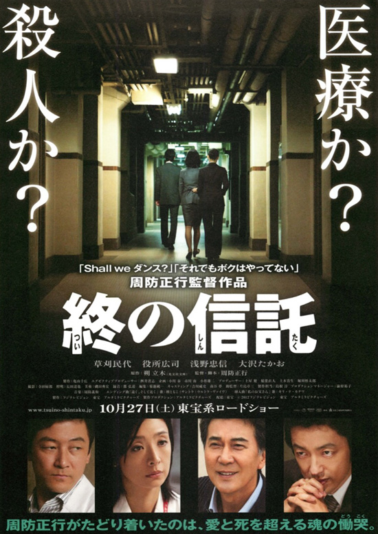 検察に呼び出された折井医師が、長い時間待たされる間に3年前の出来事を振り返るという形で描かれ、最後は折井医師と塚原検事の激しいやり取りで問題提起することで「医療か殺人か」を考えさせる映画です。長い映画で、終末治療について考えさせられる内容ではありましたが、あまり心に響くものはありませんでした。その原因は、折井医師の感情に流される個性、判断や行動の軽率さがあげられます。折井医師に感情移入できないと、最後の塚原検事とのやりとりも説得力がありません。ただ、自分が延命治療を必要とする身になった時に、自分ならばどうするかという思いは持ちました。その判断は、元気な今下す判断と、その時々の状況で願う判断とはたぶん異なるだろうなということしかわかりませんでした。終末治療、延命治療は、それほど難しい問題です。