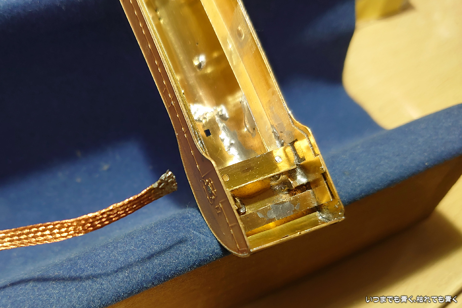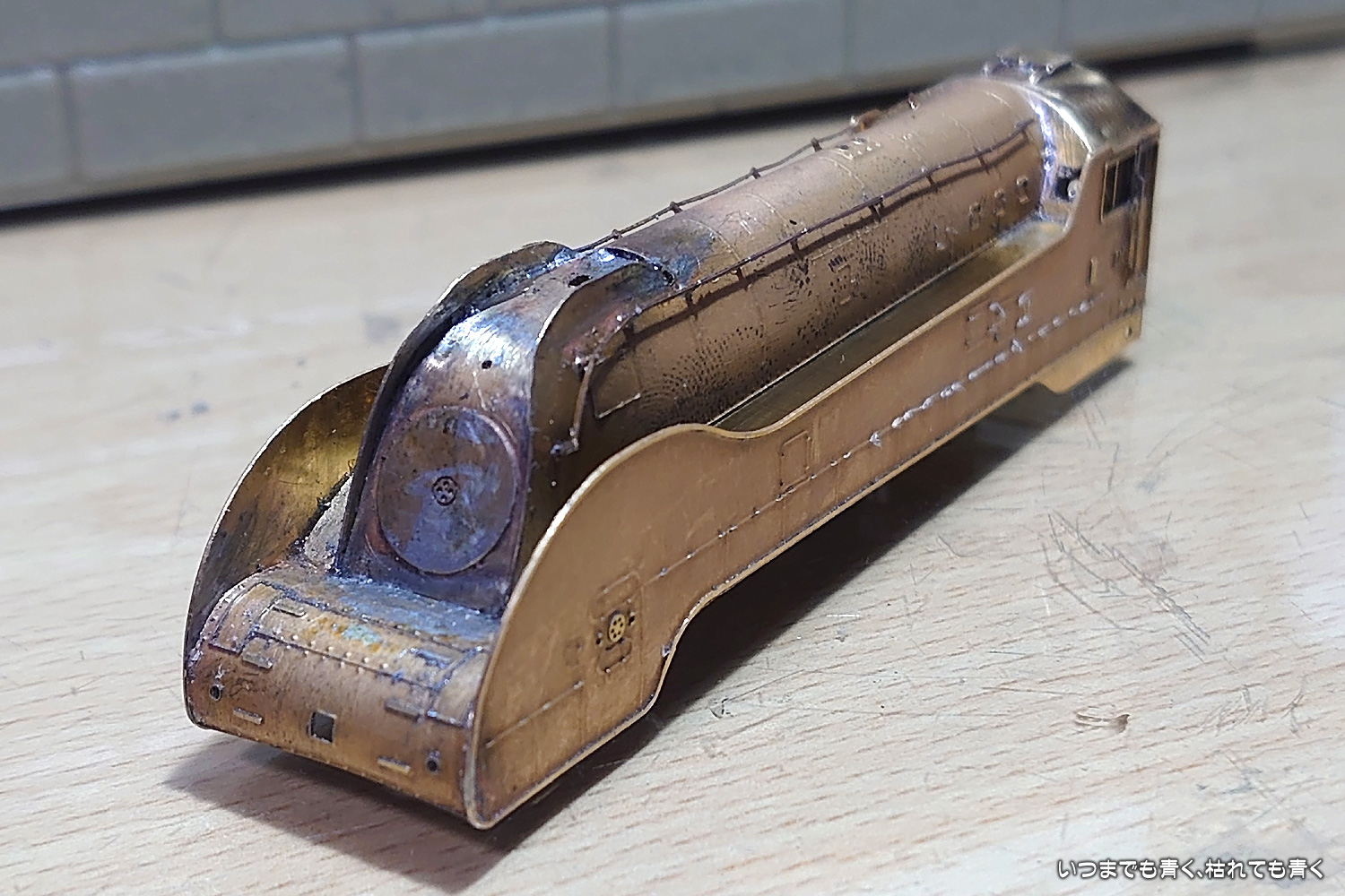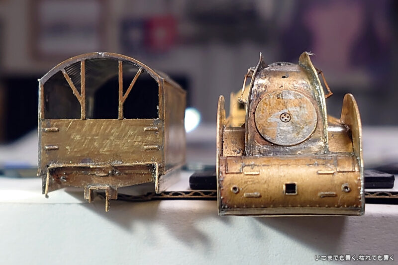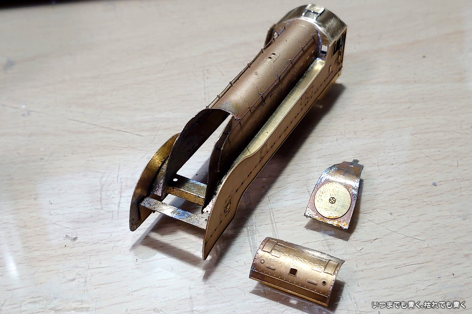 散歩に行く前に、取り外すパーツを固定しているハンダをハンダ吸取線で取っておこうと思って始めた今日の作業ですが、ハンダを吸い取って下部前面パーツとボイラー前蓋が本体からはずれたのは2時間後。ちょうど散歩に行く時刻だったのですが、欲を出して修正取付作業に手を出してしまいました。今度は、カプラー高さを確認しながら実車の写真とも見比べて慎重に下部前面パーツを取り付けました。そのあとボイラー前蓋を取り付け終わってなんとか一区切りついたのが2時間半後。ボイラー前蓋の取り付けはガイドとなるツメが無くなっていたので一苦労でした。結局、散歩は行けない時刻になりましたので、全体のはみ出したハンダの除去作業、写真撮影などが終わったのが作業開始から5時間20分後でした。休みなしで私もよく頑張ったものです。でも、思ったよりは障害も無く取り付け直しができたので良かったです。