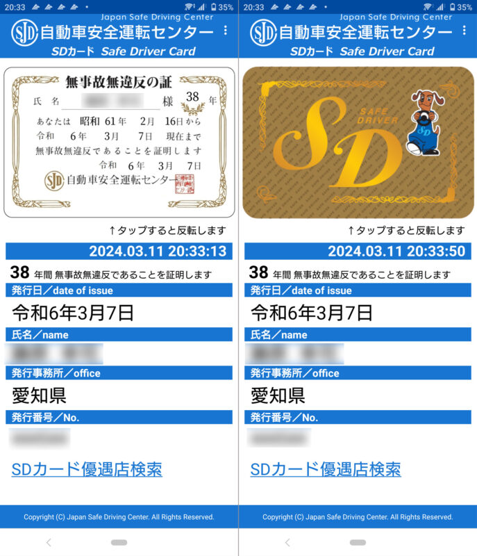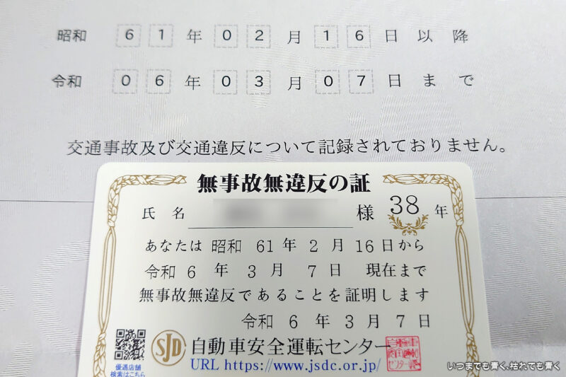 3年ごとに申し込んでいる「運転経歴に係る証明書」の内の「無事故・無違反証明書」が本日届きました。毎年申し込むこともできるのですが、有料なので私は3年に一度としています。今度は区切りのいい2年後の40年に申し込むつもりです。交通ルールさえ守っていれば無違反は難しくありませんし、たまに起こしてしまう物損事故や被害事故も警察の処分が無ければ事故経歴にはなりませんので、自分でルール順守の意志と安全行動さえ意識していれば無事故無違反はそれほど難しいことではありませんが、意識しないとこれほど難しいこともありません。このまま、人生を終わるまで、または運転免許を返納しなくてはいけない時まで継続するという意識を持って、これからも安全運転に心がけたいと思います。なお、この3年の間に、無事故無違反の証を表示できるスマホアプリができたようです。さっそくインストールしてみました。