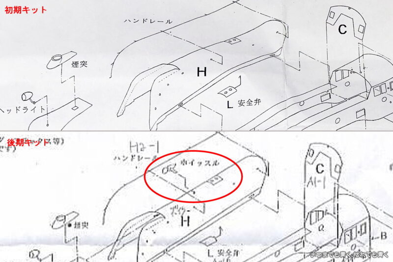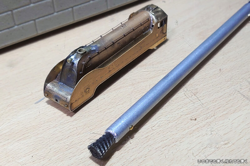 お値打ちで実用的なキサゲ刷毛を見つけたので、それを買って、はみ出たハンダの除去作業を再開しました。Nゲージ用には少し大きい感じがしますが、それでもいい感じで使えます。片側を平型に潰してしまえばより使いやすくなりそうです。ところで、またパーツ不足を見つけてしまいました。ボイラーに穴が開いているのでなんだろうと思ったらホイッスルの取り付け穴でした。組立説明書にはそんな記述はありません。後期キットには記述がありますので、今製作中の初期キットはパーツ自体が無かったのか説明書の記載漏れなのか、ワールド工芸さんにまた聞いてみないとわかりません。今回何度も不足パーツや不備パーツを無償で送っていただいているので、ホイッスルくらいは自作してみようかなと思って、手持ちの雑誌の中で図面がないかどうか調べたら、「鉄道模型趣味」の1974年7月号に掲載されていましたので、この図面をもとにして製作して観ようと思います。Nゲージの小さなパーツになりますので、かなり簡素化した形状になると思いますが、こういうのもまた楽しいものです。これだけ苦労して手をかけて製作しても、動力ユニットが良くないので「動く鉄道模型」としては遊べないのが残念ではありますが。
