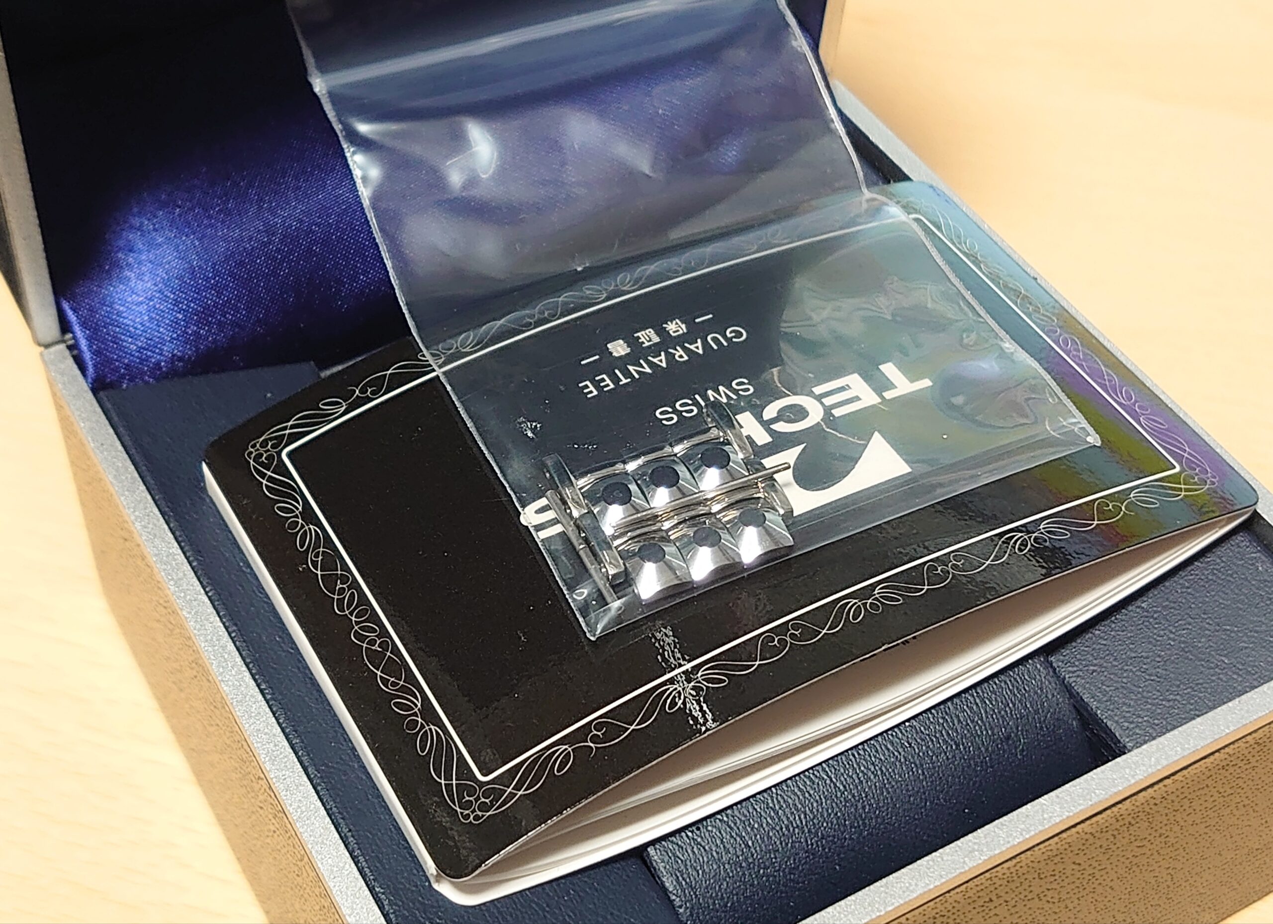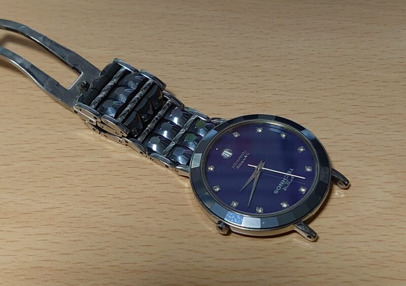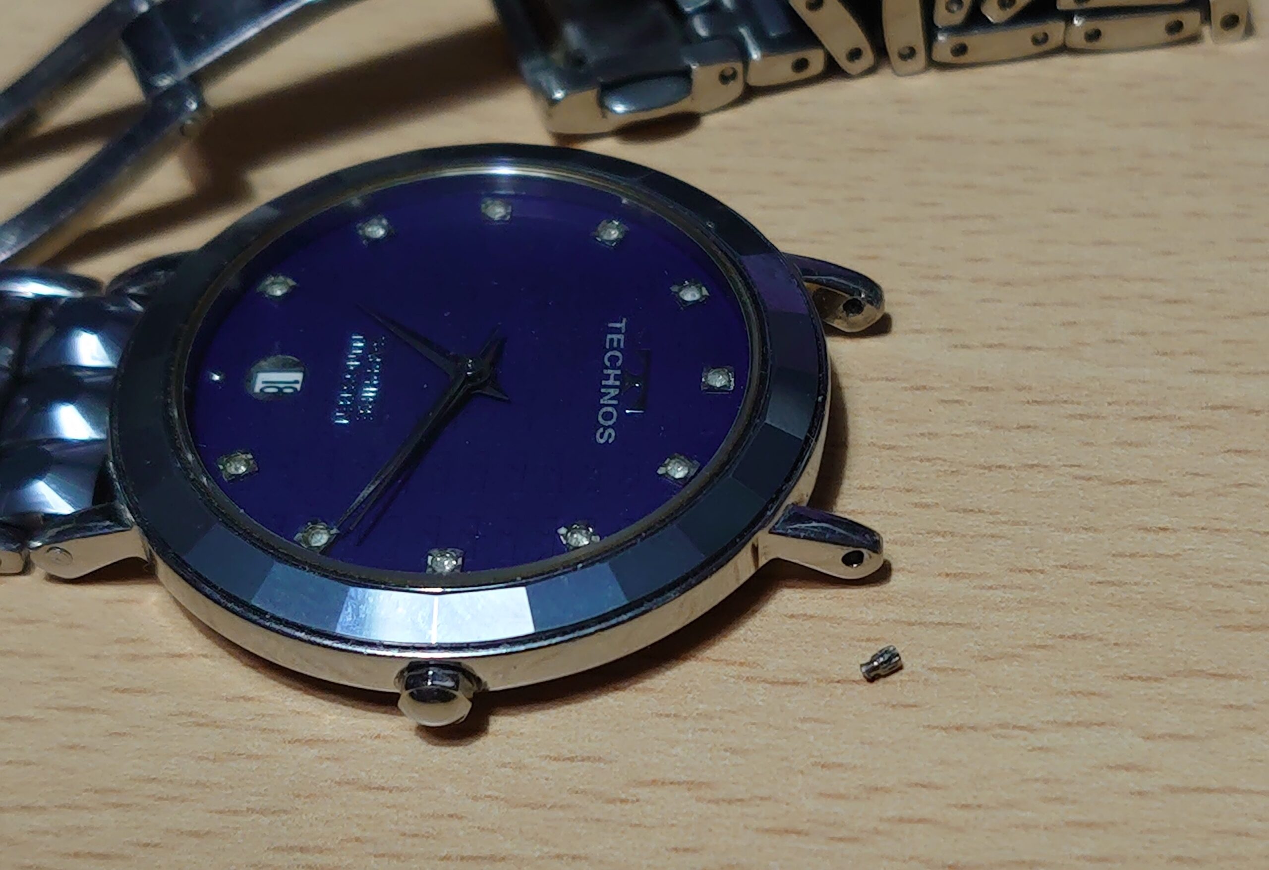 左手を上げたら腕時計がスルスルと肘のあたりに移動するのを感じたので、腕時計を見てみると本体とバンドのところのピンが折れて外れてしまっていました。すぐにいつもの時計店に持っていって修理をお願いしたら、折れて残ったピンが取れないのとバネ式ではないピンが無いということで、メーカー修理になるとの回答。仕方がないと思ってかかる時間を聞いたら、見積もりに2週間、修理に1ヶ月から2ヶ月もかかるとのこと。それじゃ自分でやったほうが早いかもと思って、帰宅後修理を開始。ピンバイスで抜けない折れたピンの中心に凹みをつくり、そこに千枚通しをあててハンマーで叩いたらなんとか取れましたが、それだけで1時間以上かかりました。本体とバンドの間のピンとは仕様が違いますが、時計ケースに入っていた予備のバンドのピンを使って時計とバンドを取り付けたら修理完了です。とりあえず自分で直せて良かったです。
