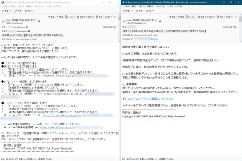 タイミング良くe-Tax(国税電子申告・納税システム)から2通のメールが昨日と今朝届きました。宛先のメールアドレスが一つは私の通常に利用しているアドレス、もう一つはネット利用のための捨てアドレスなので、簡単に本物か偽物かはわかるのですが、同じようなタイミングで届くというのがなんか気持ち悪いですね。こういうのが来るとどんなふうに騙そうとしているのか興味がわくので、正式なものとそうではないものを比較してみました。だいたい迷惑メールは文字が大きいというのが傾向ですね。しかし、3月22日に送られてきて有効期限が3月19日とは。こういうところも詰めが甘いですね。それとe-TaxとE-Taxがごっちゃになっていますし、そもそもアカウントを登録しろというのもおかしなものです。この程度のレベルのものなら絶対に騙されませんが、そのうちに本物かどうか区別のつかないものも出てくるのでしょうね。気を付けないといけません。