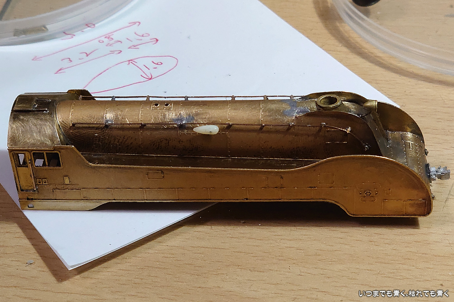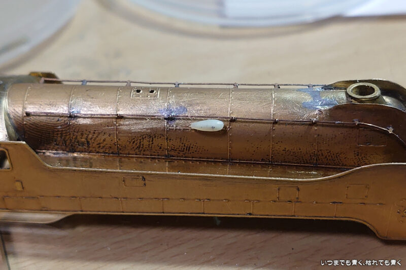 ワールド工芸「C55流線形」製作記_20240331 車両製作 2024年3月31日(日) 22:542024年4月1日(月) 17:42 ようやく重い腰を上げてホイッスルの自作を開始しました。素材は真鍮にしようと思ったのですが、加工に時間がかかりそうなので、手っ取り早くプラ材の2mm丸棒としました。図面から寸法だけ計算してそれをもとに現物合わせで棒ヤスリと耐水ペーパーで整形していきます。ボイラーに取り付けると図面とはちょっと違う感じ。整形しなおしましたが、まだちょっとイメージが違います。こういうのはなかなか難しいです。もう少し汗をかいてみます。