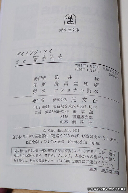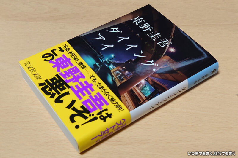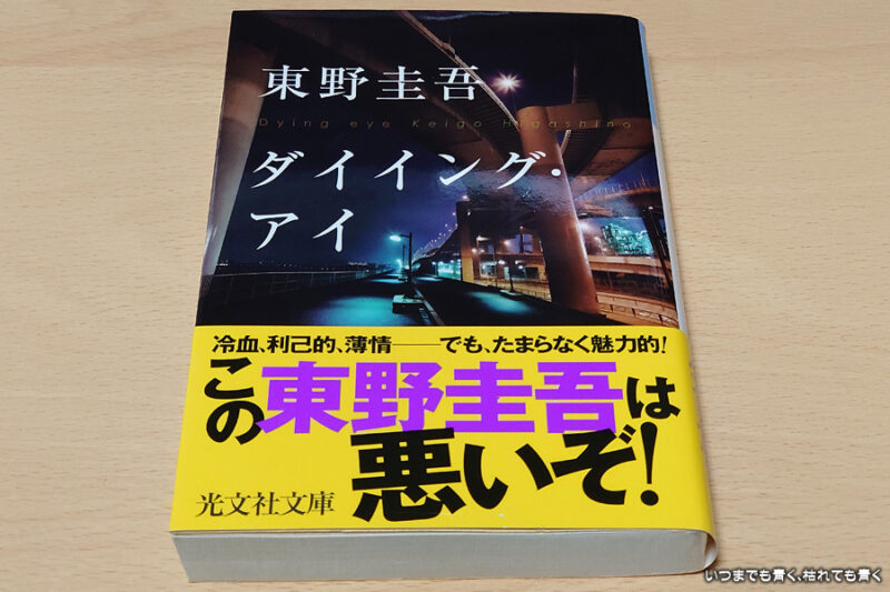 娘の試験送迎待ちの時間を利用して一気に読みました。この文庫本は2016年の入院中に買って読んだ(2016年9月12日~13日)ので読むのは2度目になるのですが、内容の詳細はほとんど忘れていましたので、新鮮な気持ちで読むことができました。この小説は、ミステリーですがホラー的要素も少し含まれています。交通事故に遭って死ぬ直前の被害者の視線(=ダイイング・アイ)が加害者に影響を与えて関係者に復讐を企てるというストーリーです。その視線による影響がメンタル的なものなのか、被害者の霊による復讐なのか、そのあたりは明確にされていませんが、不気味な怖さを感じます。物語は、その交通事故の加害者であるバーテンダー・雨村慎介が被害者の夫に襲われるところから始まり、事故の記憶を無くしてしまった慎介の視点で、記憶を取り戻すためにいろいろと調査していくという形で進んでいきます。正体不明の瑠璃子という女性が絡んできて、交通事故は、複雑な身代わり加害者による真実の隠蔽であることが明確になっていき、瑠璃子の正体も明かされていきます。一度読んでいる小説ですが結末も覚えていませんでしたので、その関係者の複雑と緻密さは秀逸で、それが解明されていく過程とどういう結末なのかの興味に引き込まれていって、とても面白い内容の小説でした。