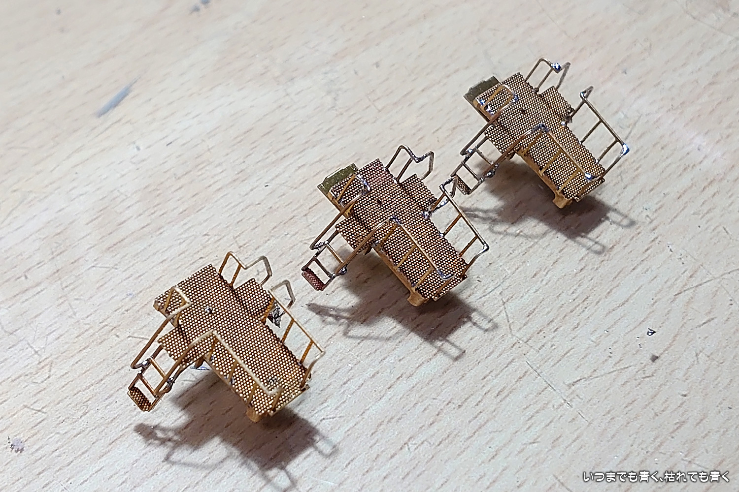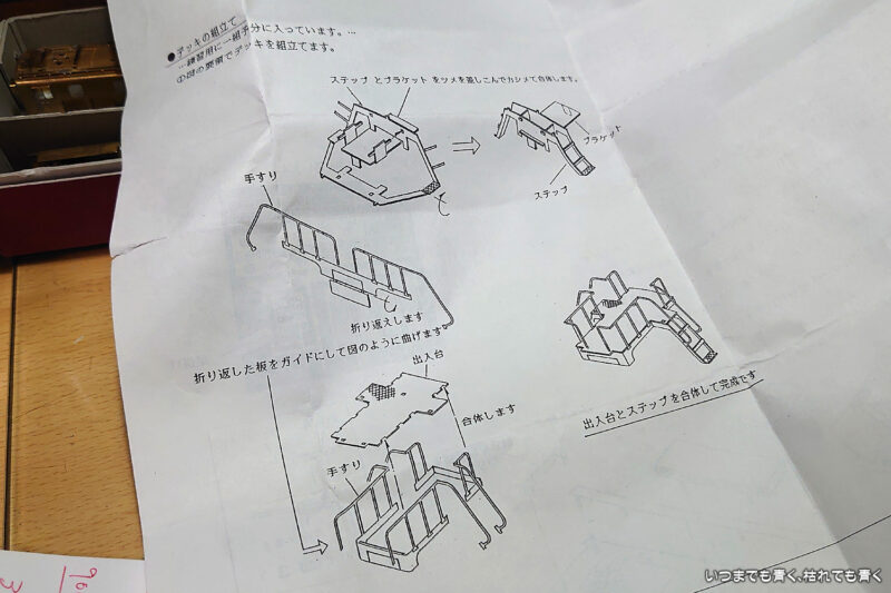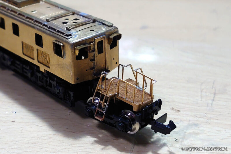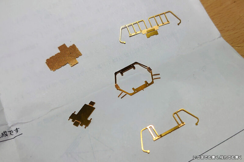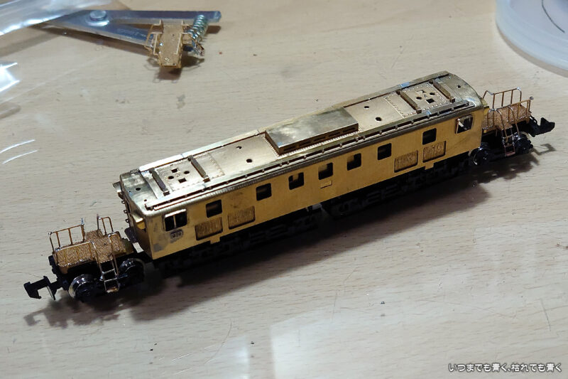 今日はデッキ部分の組み立てを実施しました。デッキは車両の両側にふたつ必要ですが、パーツは3個入っています。ひとつは練習用と書いてあったので、一筋縄ではいかない細かい工作の予感がします。最初に製作したものはけっこう順調にうまくできたのですが、パーツの向きを間違って組み付けてしまったことに気づき、結局3個作るはめになってしまいました。3個で3時間かかる工作でした。はみ出したハンダの除去をまだしていませんが、全体でどんな雰囲気になるのか車体と下回りと仮組みしてみました。なかなか格好良くなってきました。不足パーツは通風口だけだとわかってきましたので、そろそろワールド工芸さんにパーツがあるかどうか確認しようと思います。