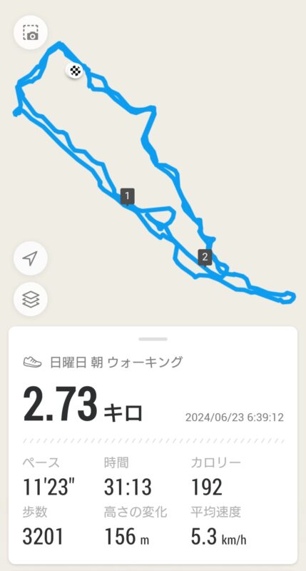 朝の散歩と今日の空_20240623 運動の話 2024年6月23日(日) 8:422024年7月3日(水) 7:47 歩く前に一時的に強い雨が降りましたが、その後はポツポツ降る程度で助かりました。風はありますが、それほど冷たくもなく、蒸し暑い朝です。家の近くに戻ってきたらもう1周歩きたくなって、コンビニで買った朝食を持ったまま今朝は2周(2周目は一部短縮)歩きました。